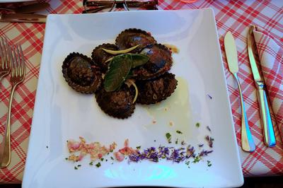 There is nothing pretentious about the inside, just arranged to make for pleasant dining. The main dish that I ate, ravioli made with squid ink and filled with a beautiful, soft and moist mixture using sea bass. The sauce was a light orange butter with shreds of zest, crispy sage leaves and a garnish of flower crumb. The sort of dish I wanted to fill my face as quickly as possible as it was so very good and yet, I wanted to eat it so slowly to make it last. For dessert I chose tiramisu. They tend to vary from place to place but this had the right flavour and nicely chilled on such a hot day on this year's summer visit. A chilled glass of Prosecco was all that was needed to complete the experience.
