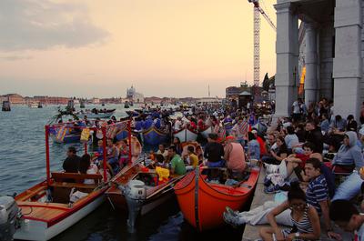 The first is the celebration of the Redentore that takes place on 13th July each year. My photo was taken sitting on the quayside outside of Santa Maria della Salute showing the local people gathering for a superb firework display that begins at 11pm. We were there at 6pm to 'bag' a place.